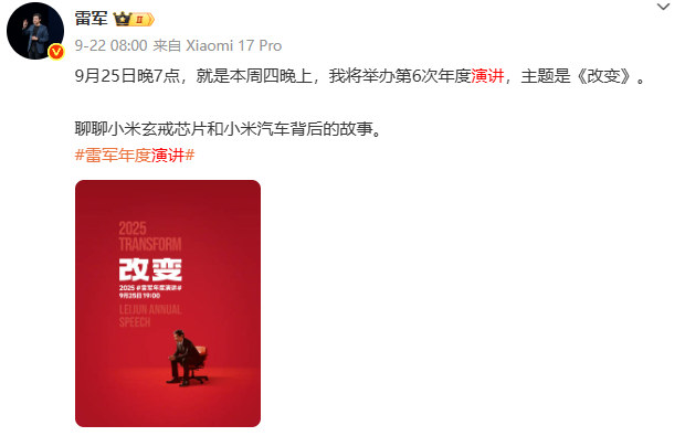 至于王乐提到的“雷军年度演讲”,将于9月25日晚7点举办。小米董事长兼CEO雷军表示,这将是他举办的第6次年度演讲,演讲主题是《改变》。他将分享小米玄戒芯片和小米汽车背后的故事。CNMO注意到,目前某平台相关话题阅读量已超120亿,讨论量突破了160万。