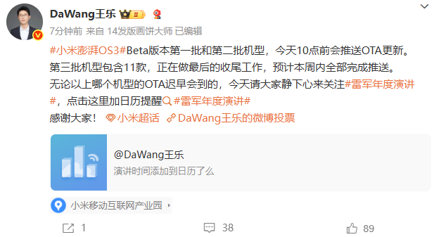 小米王乐:澎湃OS 3 Beta版第三批机型本周完成推送