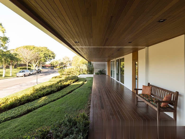 房子两侧巨大的混凝土墙用于遮挡外部视线,保护隐私。这样的方式同样用于建筑背面的娱乐空间。南立面双层高的玻璃窗为整个起居室提供了欣赏Lake Guaíba绝佳的的视野。北立面的悬臂梁和遮阳板避免了阳光直射,这也是四个卧室被安排在背面的原因。从屋顶上延伸至庭院的钢架创造出一种房屋连接着室内外,并且自我伸展的感觉。