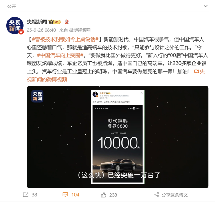 9月26日消息,央视新闻今日发布微博,表示其近期深入探访鸿蒙智行合肥尊界超级工厂及核心供应链企业,首次全面展示了百万级豪华轿车尊界S800从研发到制造的全过程,引发广泛关注。据了解,该报道通过华为侧工艺设计师、江淮侧技术负责人及一线工人、供应链伙伴的真实讲述,呈现了尊界S800在智能安全与人性化设计上的创新突破。