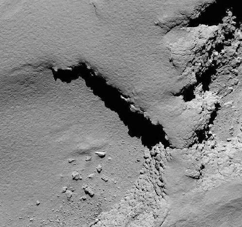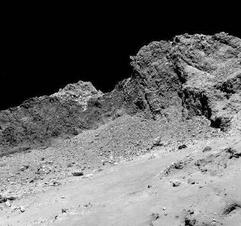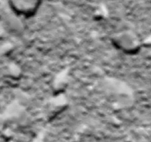 在最后时刻,罗塞塔拼了命地工作。它一边下降,一边拍照片,从22.9公里外拍到只剩51米。这些照片清楚地展现了67P的坑坑洼洼,像个月球表面。最后一刻,它传回一张模糊的照片,就跟地球说了再见。