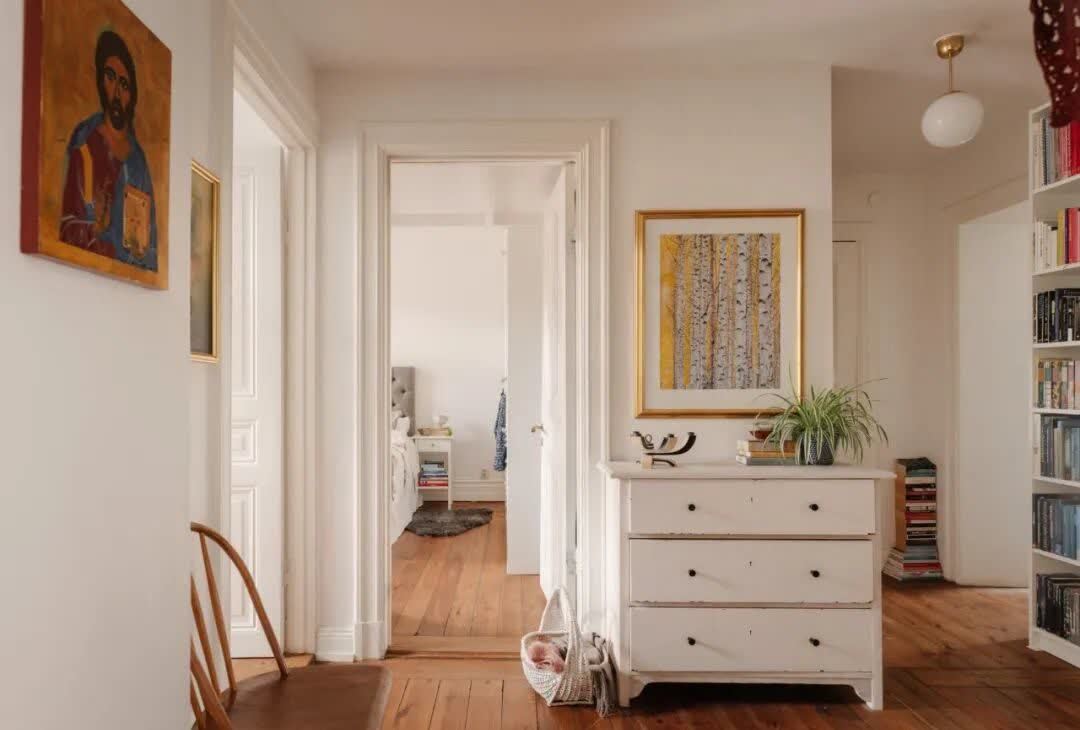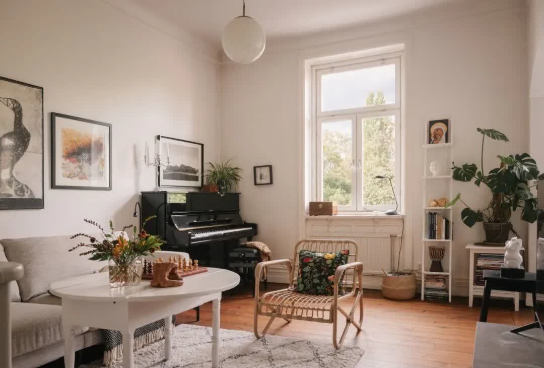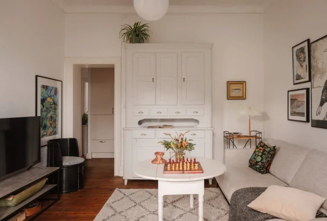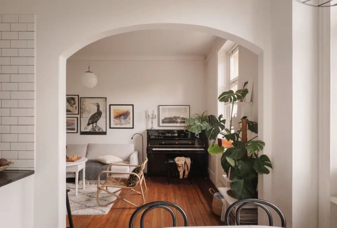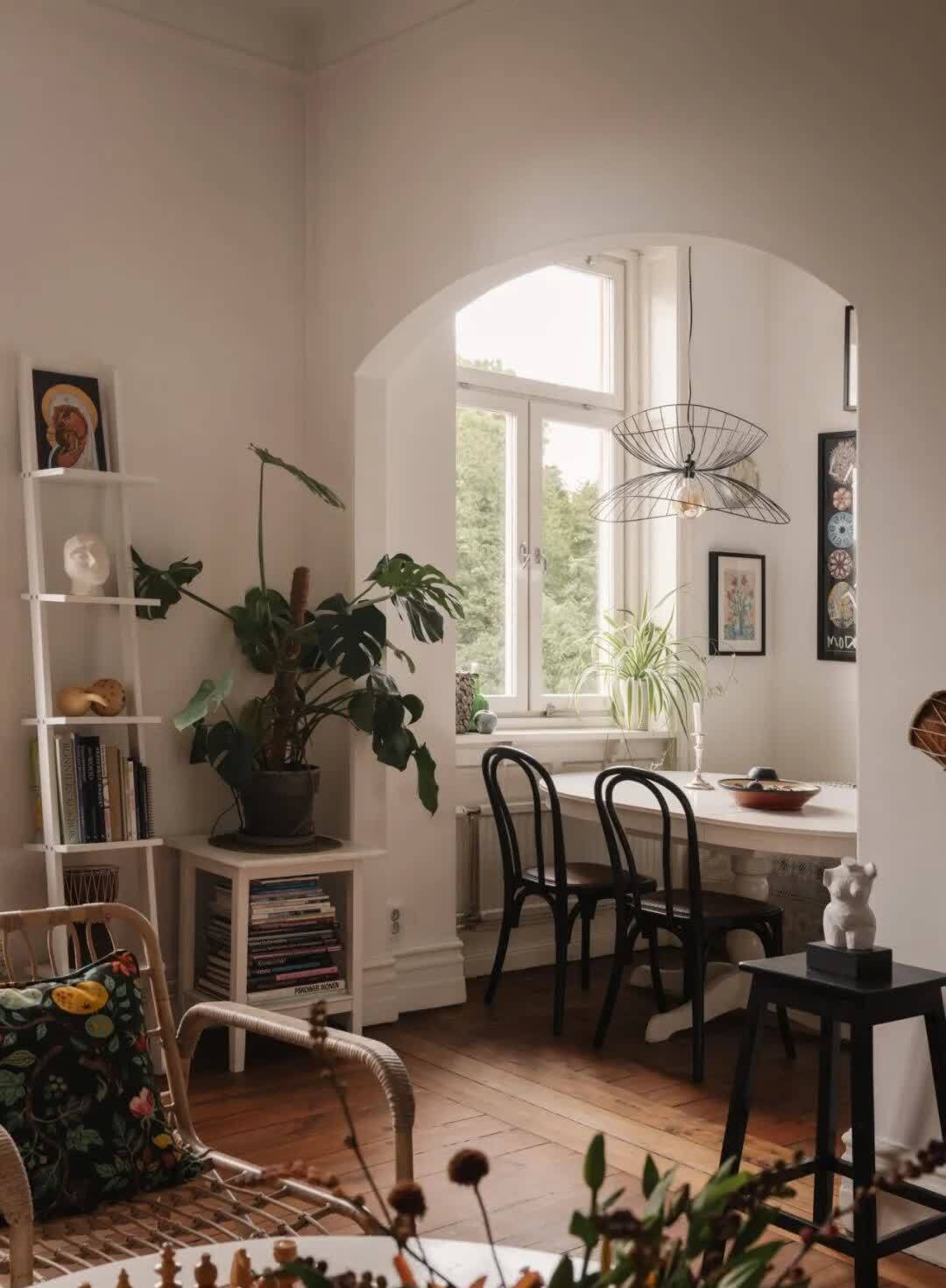 走进室内,白色与原木色经典配色,为老公寓带来明亮通透、温馨自然的视觉效果。现代布艺沙发,传统的木质折叠桌,藤椅,还有存在感极强的绿植,花朵,把户外的呼吸搬进了室内,让时光在这里停留,感受美好。