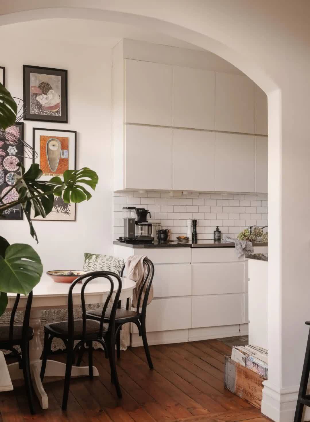 老旧木地板,为家保留怀旧元素;连接餐厨空间的弧形设计,藏着温柔与实用。与斑驳的宽木地板,以及复古风的餐桌椅形成风格对比,巧妙地融合了现代与古典,加上整体白色气质打底,通透感更强,自然田园般的氛围扑面而来。