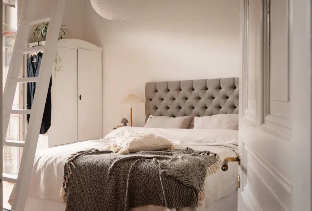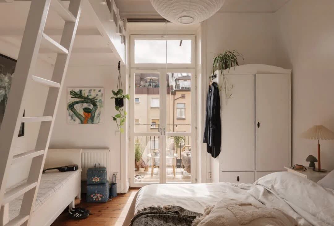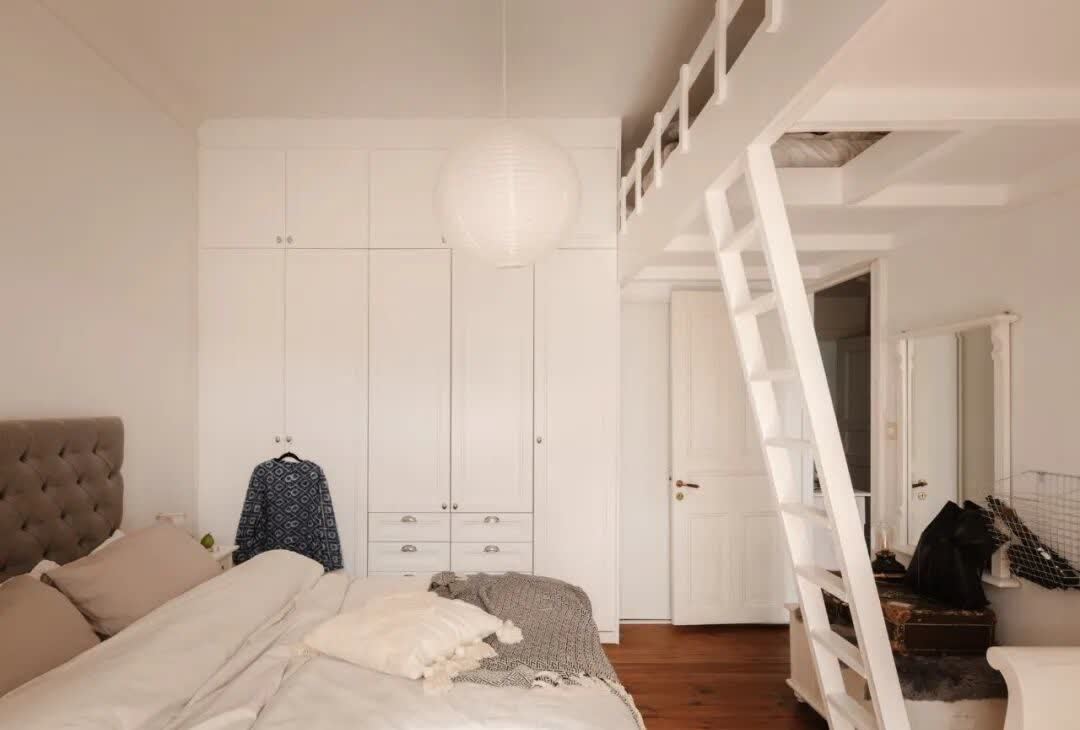 这是一个布置特别紧凑的卧室。白色系小床,衣柜,还有阁楼,显得更加简洁有序。加上复古风小五金的点缀,优雅和实用兼具,少了一些清冷,打造更适合深睡的氛围。每一处都很惬意,洒下阳光更是将浪漫拉满。