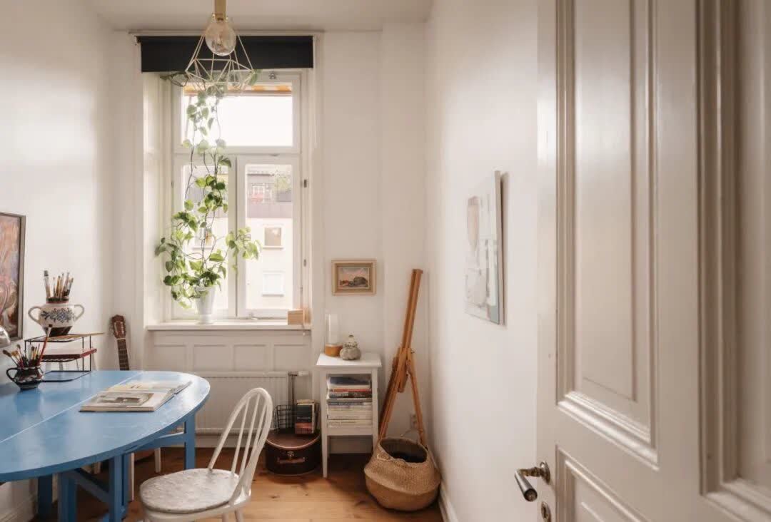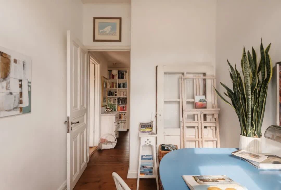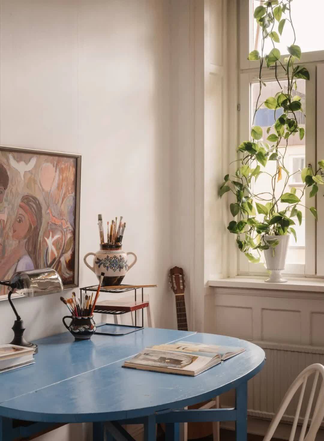 钟情复古的人,一定会希望在家里加上一些旧家具,经过一些改造,让时光在空间里慢下来。这里就像是一个还没填满的收藏空间,折叠圆桌的蓝色提亮了整个空间,淘来的木窗,陶瓷壶笔筒,还有垂下的绿植,让这里始终充满活力。