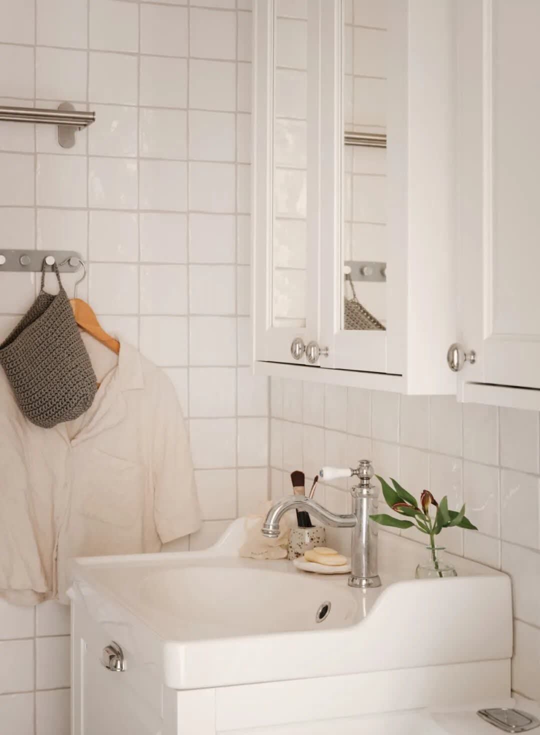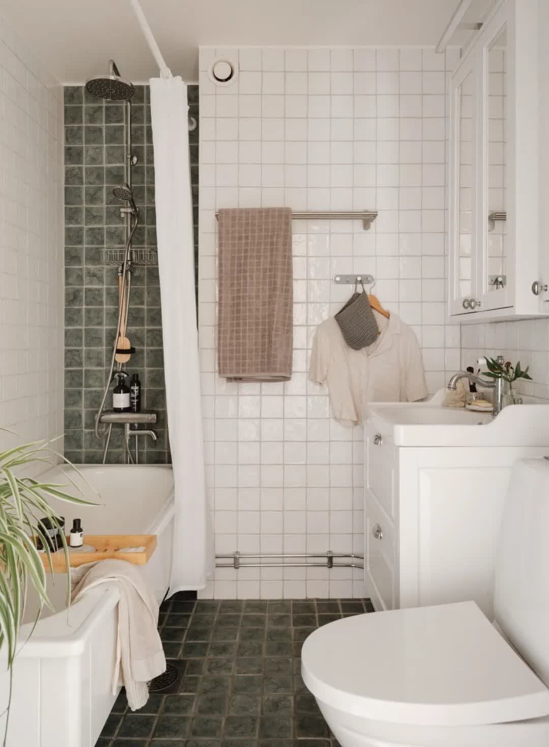 以简洁、明亮的白色为主题,与深绿小方砖形成对比,不仅在视觉上显得更敞亮,也显得更有质感。温馨小浴室,也可以尽情享受休闲的放松时光。