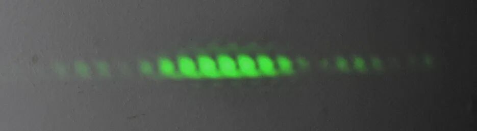 来自绿色激光器的光穿过两个相距不到一毫米宽的狭缝产生的干涉条纹 来源:维基百科