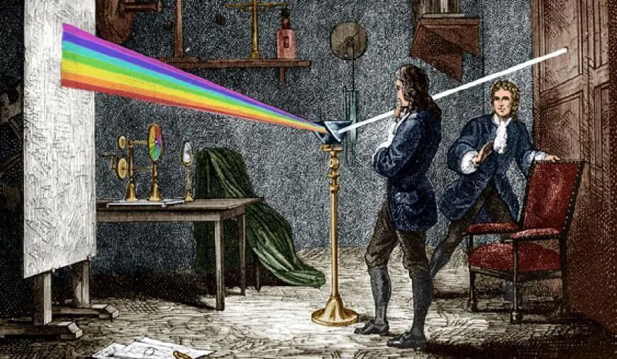 17世纪,牛顿发现白色的太阳光通过三棱镜后,被分成了七种不同的颜色——于是他推断,光是由各种不同颜色粒子组成的粒子束,而当不同颜色的光混在一起,就好像颜料在调色板上混合一样,可以组成新的颜色。根据这一推断,牛顿以微粒的运动为基础,发展了一套光学体系,这就是光的微粒说。