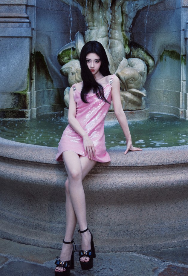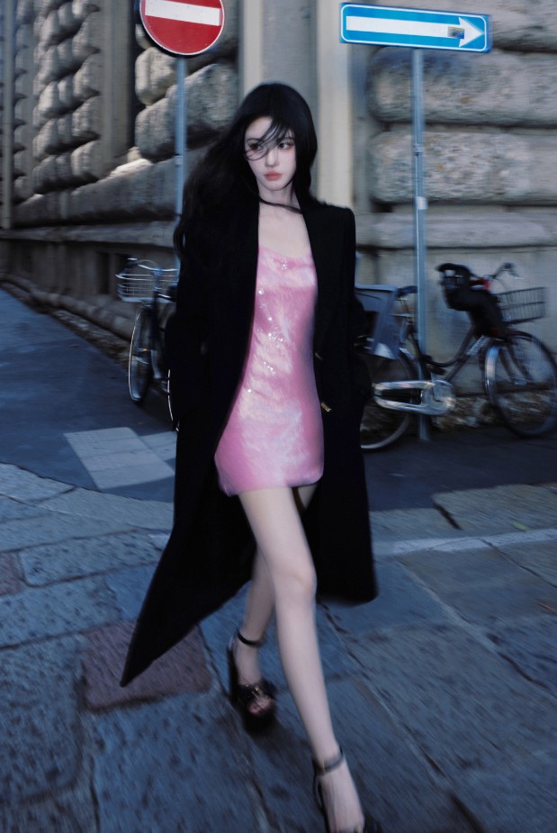 在复古喷泉场景中,她或慵懒倚靠,或优雅端坐,粉色亮片裙与充满岁月感的喷泉雕塑形成视觉对冲,复古氛围里的她宛如从旧时光里走出的时尚精灵,将甜辣风格融入复古场景,碰撞出独特的时尚化学反应。而当她身着黑色长款外套,行走在都市街头时,粉色亮片裙在黑色的衬托下更显亮眼,酷飒的外套与甜美的裙装形成风格叠穿,把“下衣失踪”的穿搭技巧玩出高级感,在街头的背景里,她就是时尚本身,将甜与飒的气场延伸到了都市摩登语境中。