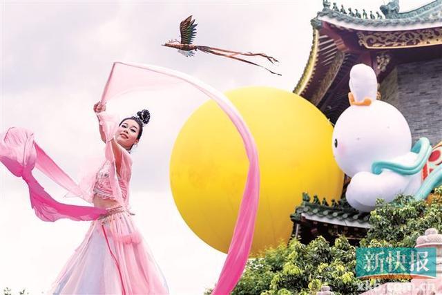 岸上风情则有“嫦娥仙子”翩翩起舞,与古建檐角的大型玉兔揽月灯组交相辉映,营造“彩云追月”的唯美意境,传递中秋佳节团圆喜庆的美好寓意,与广大游客共庆佳节。