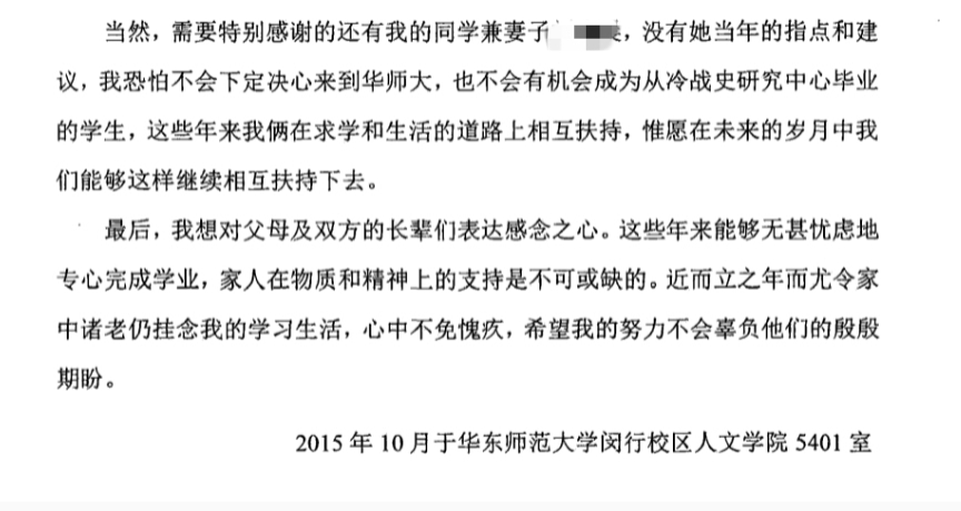 文中还对各位给予他帮助的师长、同学、好友一一给予了感谢,并表示,要特别感谢他的妻子,“没有她当年的指点和建议,我恐怕不会下定决心来到华师大,也不会有机会成为从冷战史研究中心毕业的学生,这些年来我俩在求学和生活的道路上相互扶持,惟愿在未来的岁月中我们能够这样继续相互扶持下去。”
