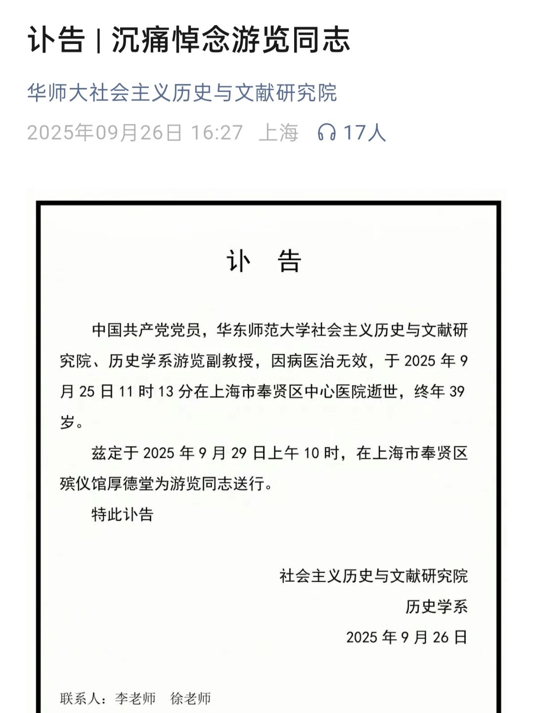 大皖新闻讯 9月26日,华东师范大学社会主义历史与文献研究院、历史学系发布讣告:中国共产党党员,华东师范大学社会主义历史与文献研究院、历史学系游览副教授,因病医治无效,于2025年9月25日11时13分在上海市奉贤区中心医院逝世,终年39岁。