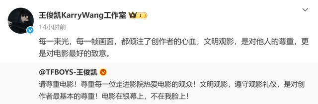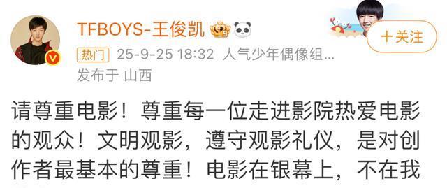 9月25日,王俊凯发文呼吁大家文明观影:“请尊重电影!尊重每一位走进影院热爱电影的观众!文明观影,遵守观影礼仪,是对创作者最基本的尊重!电影在银幕上,不在我脸上! ”