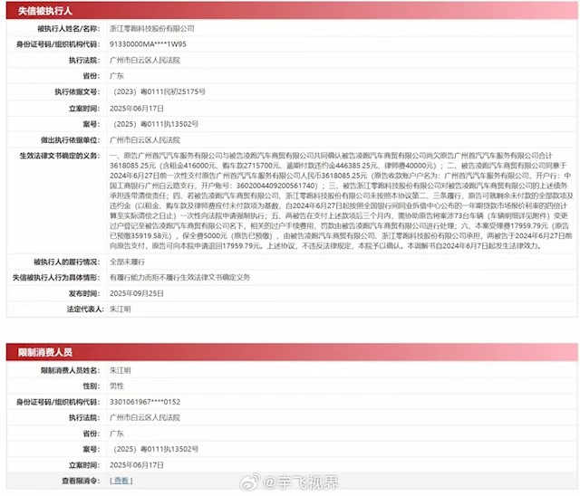 零跑汽车作为母公司需承担连带清偿责任,但因“有履行能力而拒不履行生效法律文书义务”,于2025年9月25日被广州市白云区人民法院列为失信被执行人。