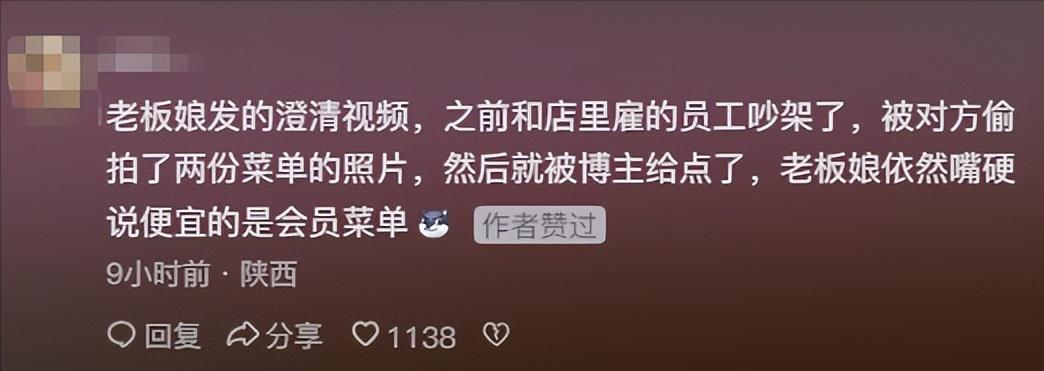 眼见事情闹大了,老板娘就出来澄清,结果她的澄清反倒是把她有两个菜单的事锤的死死的。