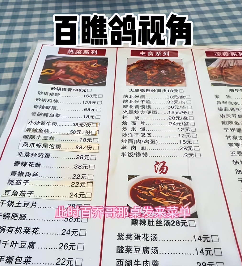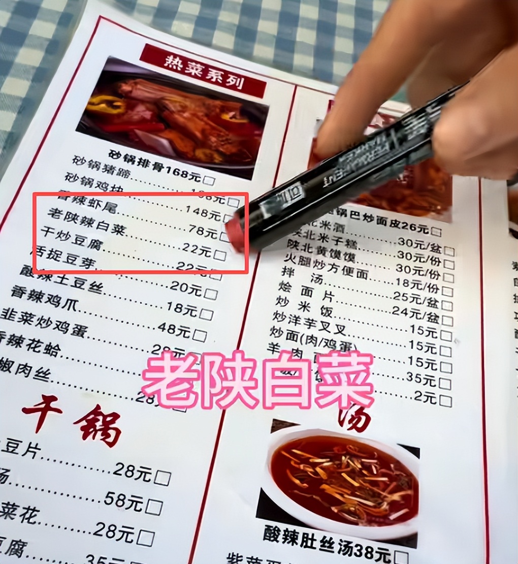 他明明指的是上面的菜单,但是老板娘却拿出放在下面的一沓菜单展示,称店里就这一种菜单。