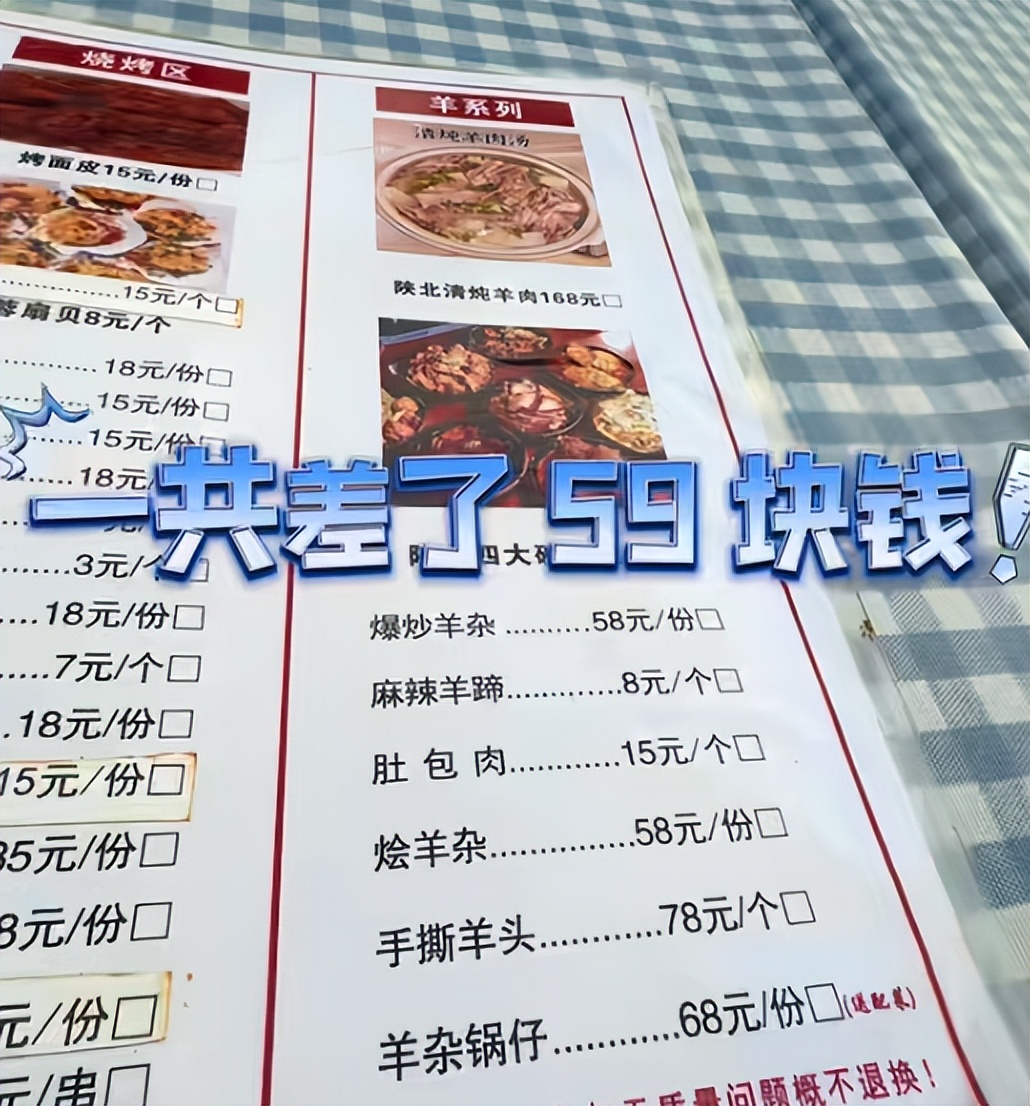 没想到还真发现了,明明点的菜都一样,结果结账的时候他却比朋友多花了59元。