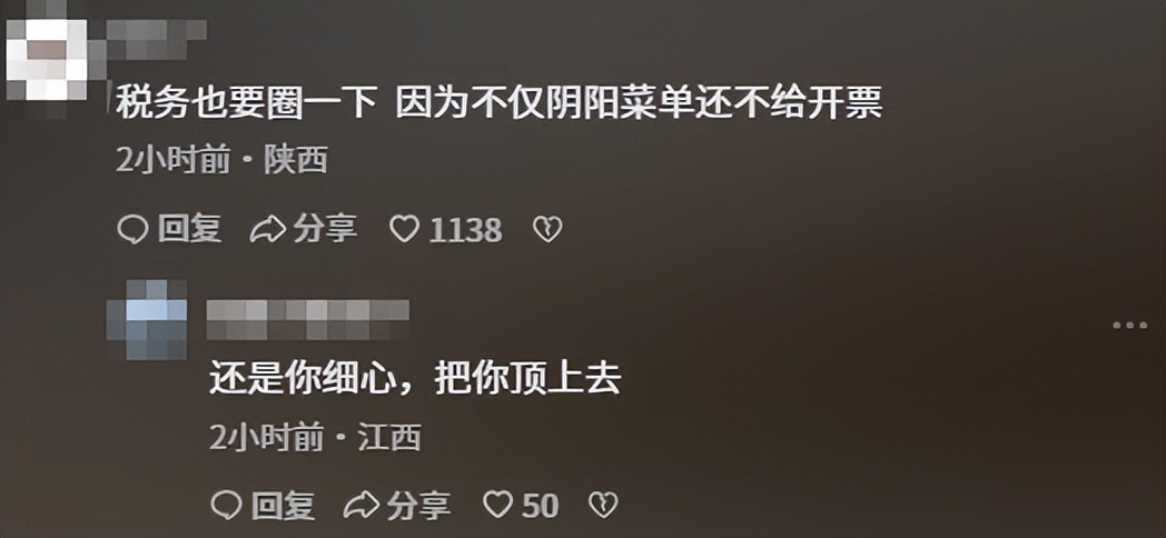 这阴阳菜单算是扰乱市场秩序了,更过分的是它还不给开发票,网友们也冲到了延安税务的评论区。