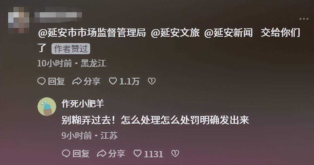 也有网友联系延安文旅和市场监督管理局,让他们处理这件事,不能因为这家店而破坏了延安的城市形象。