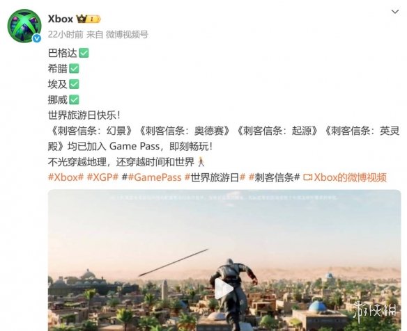 昨日恰逢"世界旅游日",Xbox官方微博发布重磅消息:四款《刺客信条》系列作品——《刺客信条:幻景》《刺客信条:奥德赛》《刺客信条:起源》及《刺客信条:英灵殿》已正式登陆Game Pass平台。