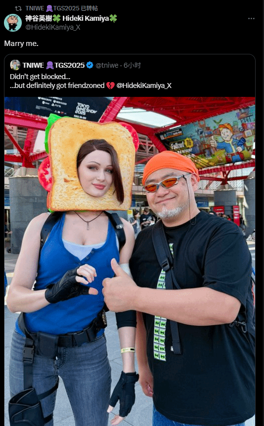 在展会现场,她还与著名制作人神谷英树合影,神谷英树随后转发了这张照片,并配文打趣道:“嫁给我吧。”