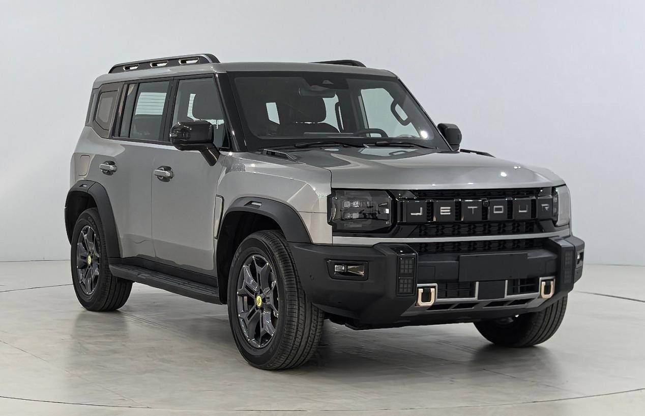 外观方面,捷途山海T2四驱版延续了标志性的“方盒子”造型,整体设计硬朗且充满力量感。前脸部分,熏黑处理的进气格栅中央镶嵌着醒目的“JETOUR”品牌标识,两侧矩形LED大灯组与格栅完美融合,极具视觉冲击力。同时,新车还配备了宽大的熏黑前包围组件,内部采用参数化设计的雾灯组,进一步提升了整车的运动气息。