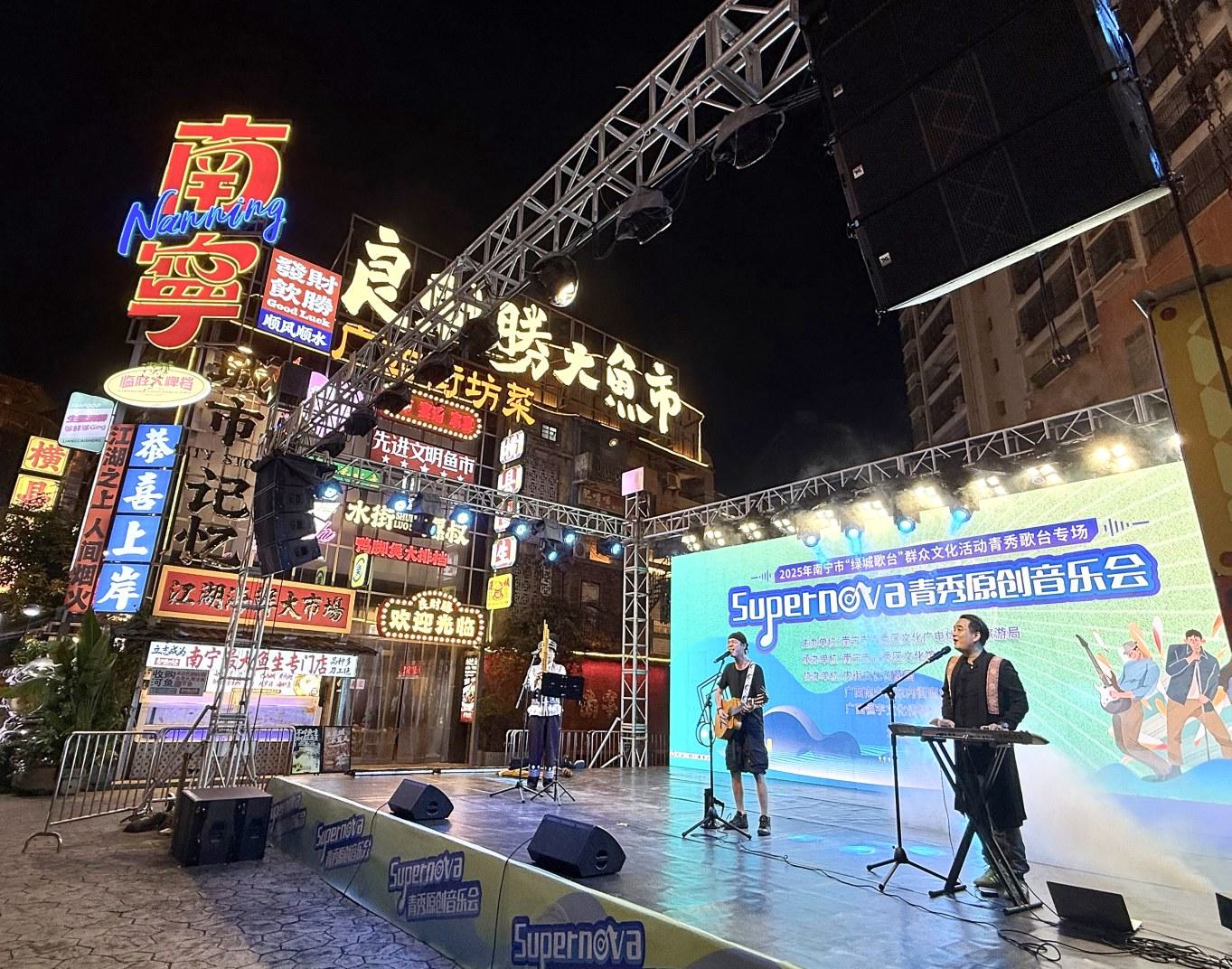 本报讯(记者陈蕾)9月27日晚,秋风轻拂,星光点缀,青秀区内街文化创意园广场化作一方音乐的天地。2025年南宁市“绿城歌台”群众文化活动青秀区歌台——Supernova青秀原创音乐会在此激情唱响。古老的天琴与现代电声交织共鸣,壮族山歌与苗族芦笙婉转呼应,这场聚焦本土原创的音乐集会,为邕城秋夜增添了灵动而深情的韵律。