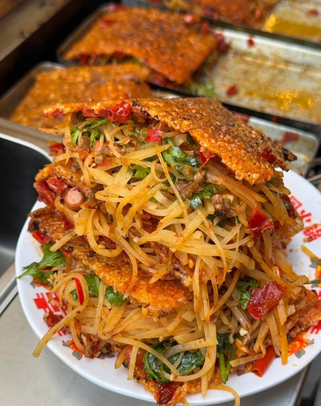 天津煎饼果子:绿豆面糊摊成薄饼,裹入油条或薄脆,撒上葱花、甜面酱,外酥里嫩,是天津人的“早餐标配”。
