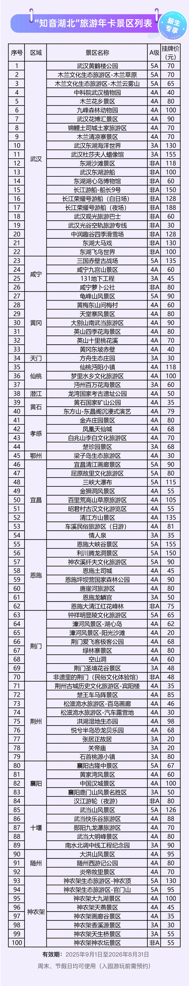 据悉,这份为新生准备的“见面礼”权益丰厚,激活后即可在一年内免门票游览湖北省内100家高品质景区,包括16家5A级景区、52家4A级景区及部分主题乐园、长江夜游项目等。