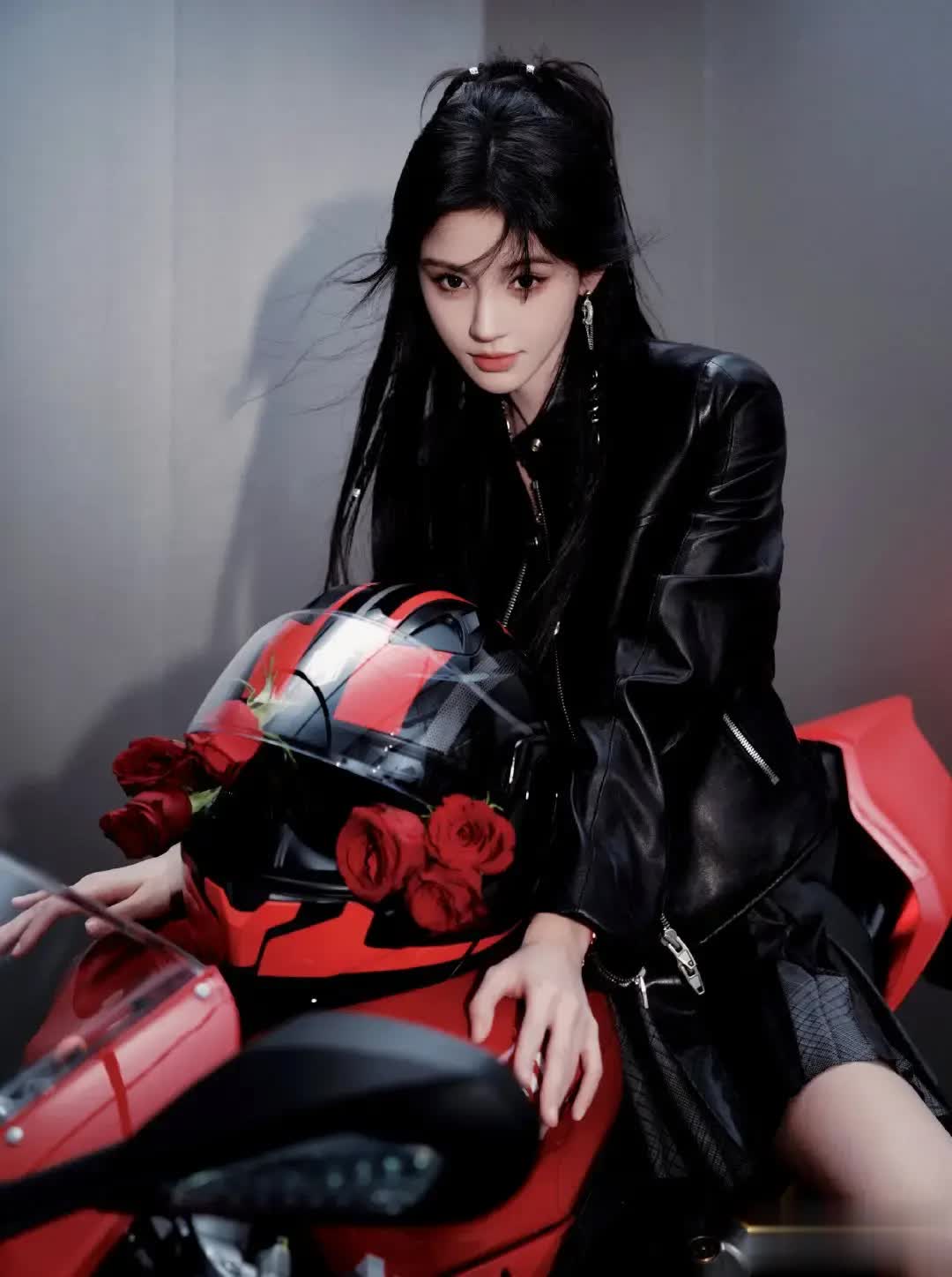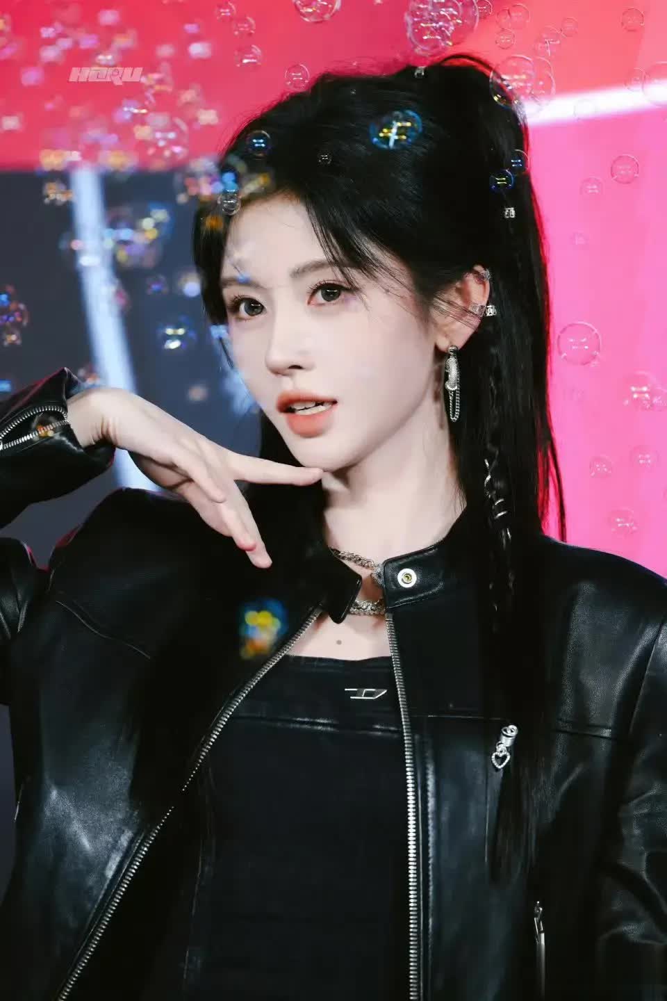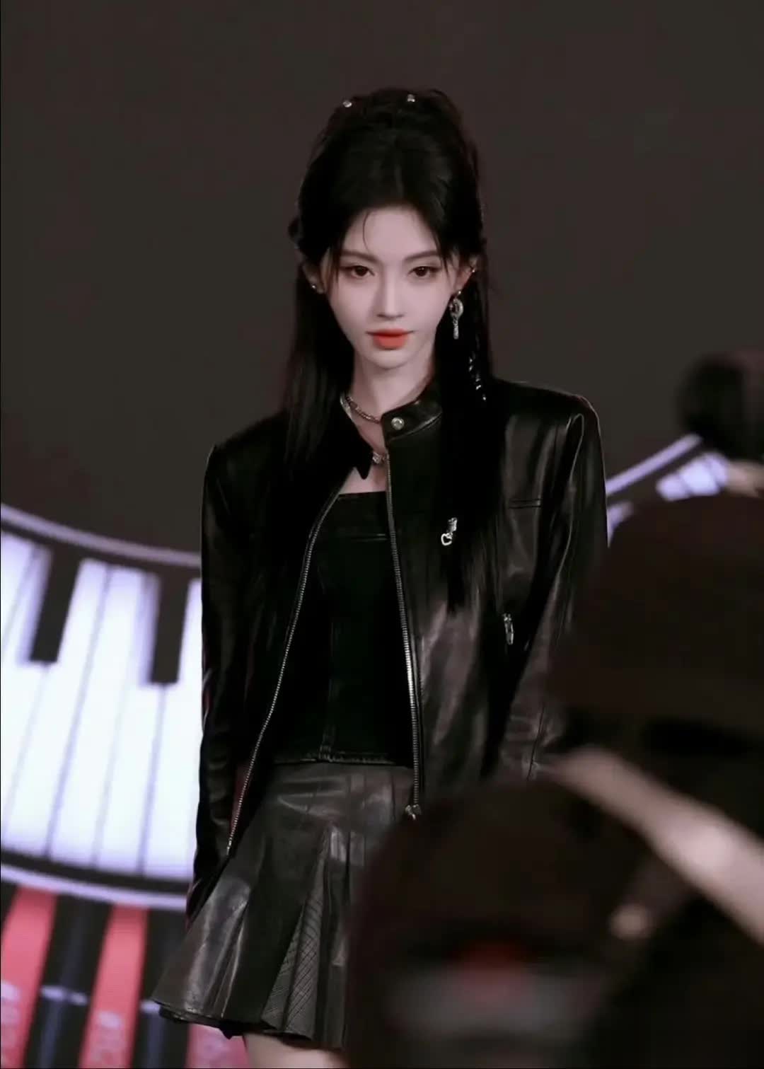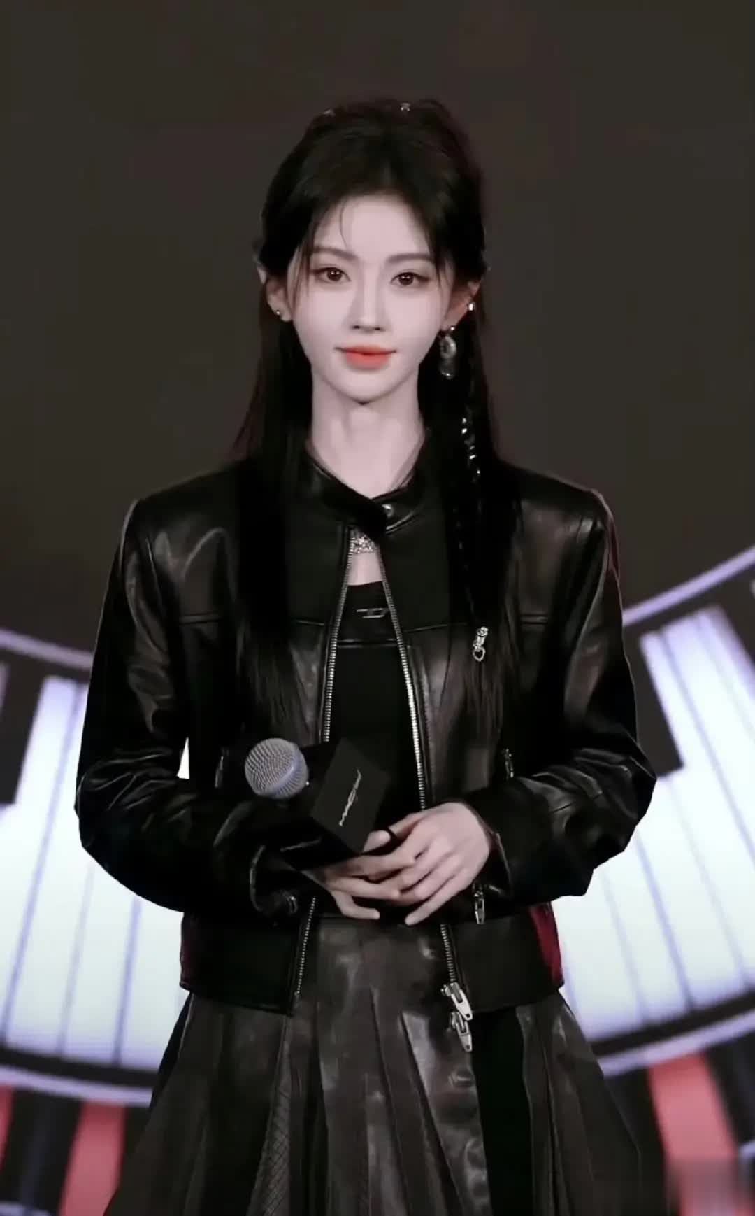 一场原本普通的MAC品牌直播,因鞠婧祎的登场演变为一场全网瞩目的“形象革命”。她以一袭黑色皮质短夹克搭配高腰短裙惊艳亮相,凌厉的剪裁勾勒出锋利腰线,金属链条与玫瑰元素在冷光下交织出未来感与力量感,高马尾将她标志性的下颌线完全释放,眼神锐利如刀。