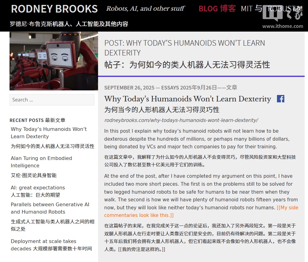 IT之家 9 月 28 日消息,据 TechCrunch 报道,著名机器人专家罗德尼・布鲁克斯(Rodney Brooks)向那些将数十亿美元投入人形机器人初创企业的投资者发出警告:你们正在浪费资金。