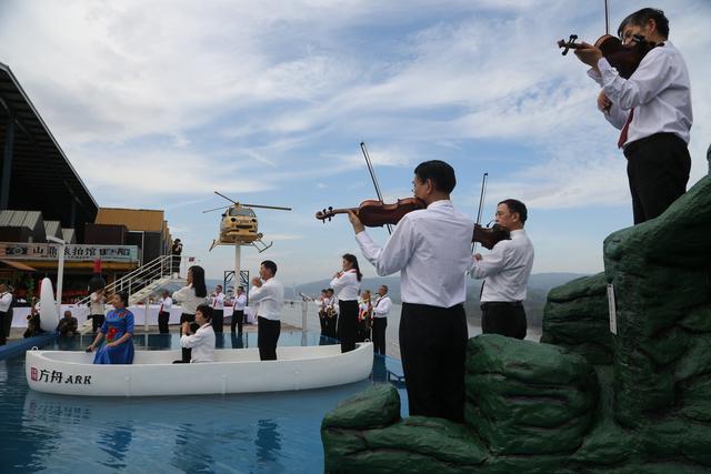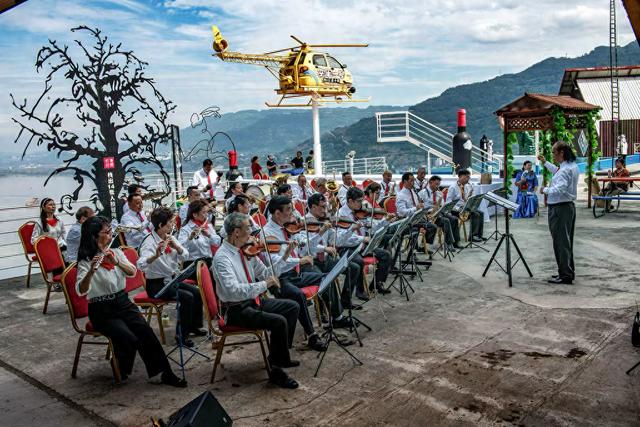 江畔露天音乐快闪在美心红酒小镇举行。景区供图 第1眼TV-华龙网讯(记者 吴礼霜) 9月27日恰逢世界旅游日,重庆川缘爱乐交响乐团与美心红酒小镇景区联合举办的江畔露天音乐快闪在美心红酒小镇奏响,为游客呈现了
