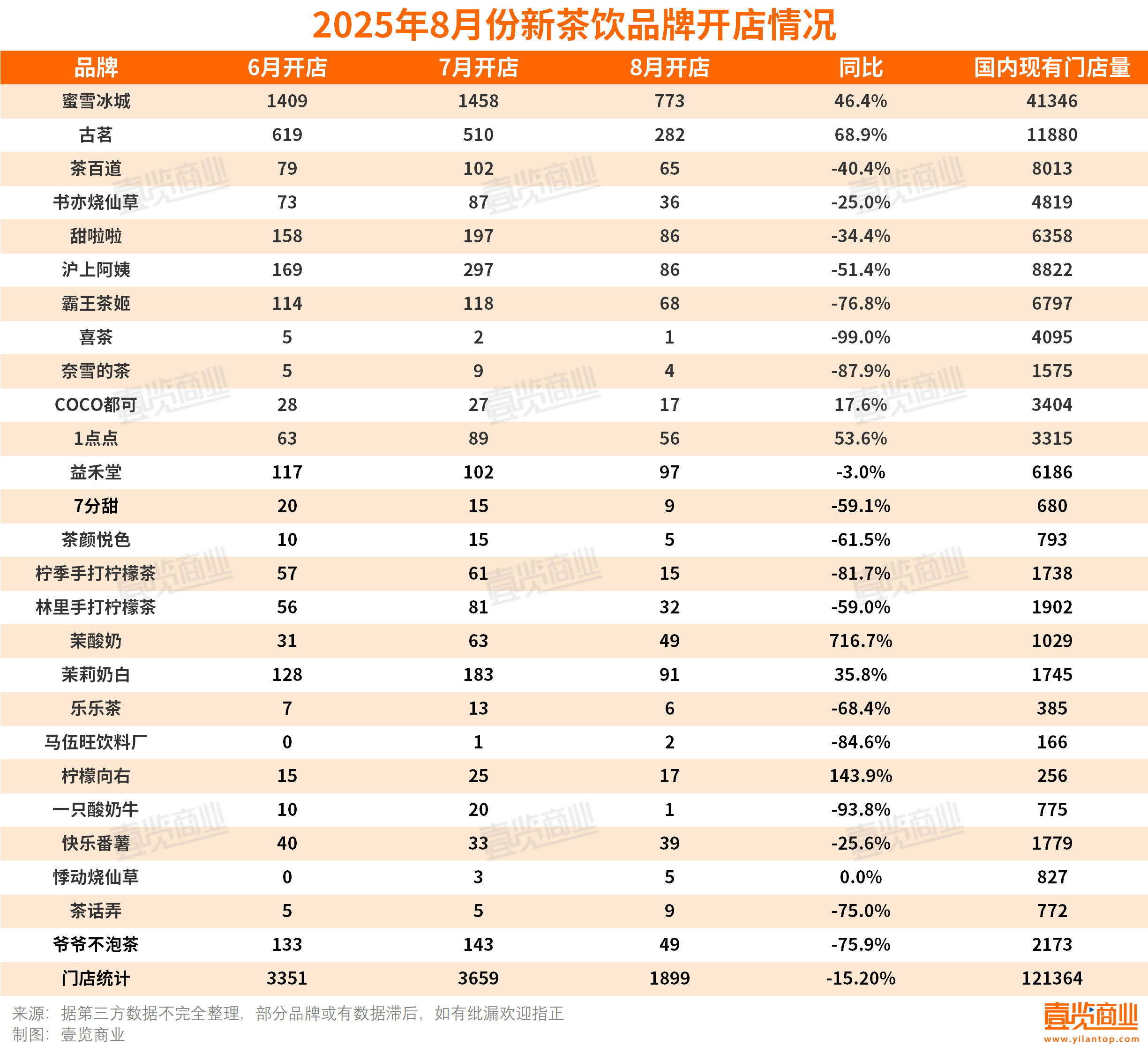 2025年8月,壹览商业跟踪的26个连锁品牌共新开门店1899家,环比7月减少1760家,同比降幅15.20%。行业累计门店总数维持在12.13万家,较7月净减663家。