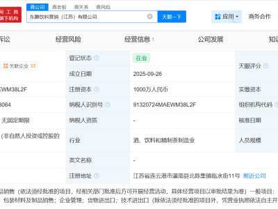 东鹏饮料在江苏成立营销公司 注册资本1000万