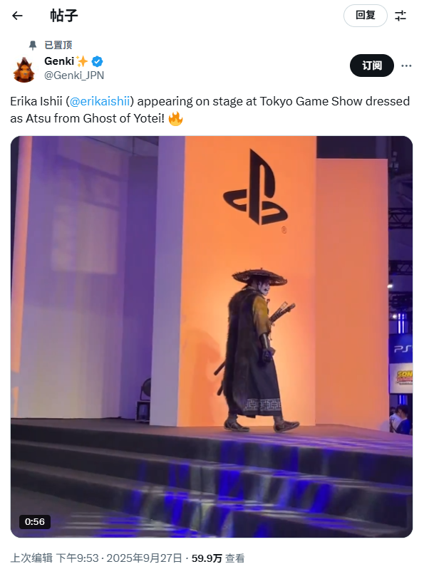 目前东京电玩展已正式落幕。近日,博主@Genki_JPN在社交平台X上公布了一段《羊蹄山之魂》女主演员Erika Ishii在展会Cos主角“笃”表演的视频,一起来看看吧!