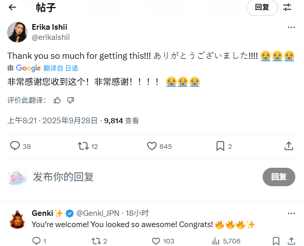 从视频中可以看出,Erika Ishii身披盔甲头戴斗笠,摘下面具后便开怀大笑十分豪爽。而在评论区里,Erika Ishii也对@Genki_JPN表达了感谢。