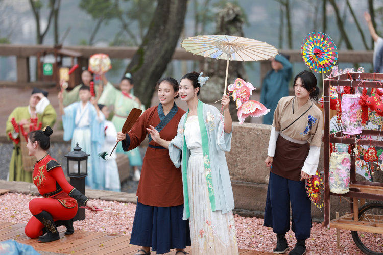 昙华寺广场上,一场以“上岸之城”为主题的情景剧又通过“战争风云”“百年宗祠”“昙华逸事”“石城花开”四个篇章,再现了磐石城从军事要塞到宗族聚落、从抗战前哨到文化地标的千年变迁。身着汉服的游客刘丹在商周祭祀演绎区跟记者格外感慨地表示:“演员的服饰和祭舞细节考究,让人真切感受到文明的传承。”