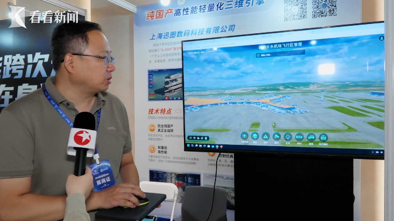 上海迅图数码科技有限公司创始人阎晨亲自坐阵,吸引不少潜在合作伙伴驻足洽谈。阎晨向记者展示了一些代表性的应用案例,包括机场、港口、工厂等场景,数字孪生的实时画面在平台上可快速调阅,“可以看到当前的实时运行状态,比如每架飞机当前起降的状态。我们是纯国产自研的三维引擎,是目前全球最小的、就是最轻量化的一款引擎,引擎的安装包只有28兆,可以支撑超10万飞行物体或者集装箱的实时运行状态。”