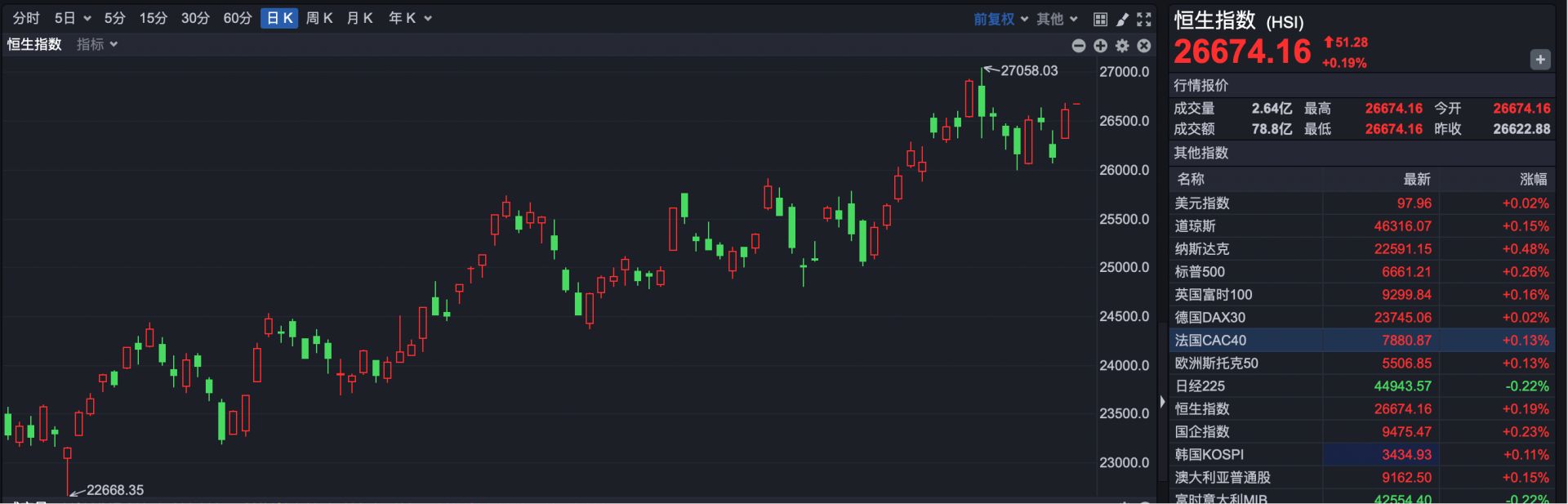 今日(9月30日),港股早盘小幅高开。截至发稿,恒生指数开盘报26674点,上涨51点,涨幅0.19%;恒生科技指数报6345点,上涨21点,涨幅0.34%。