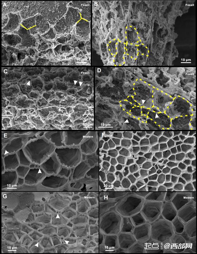 寒武系第四阶猴家山组开腔骨骨片上保存多边形有机质框架结构(A-D)与软体动物棱柱层的多边形结构(E-H),在大小与形状上均有极大的相似性