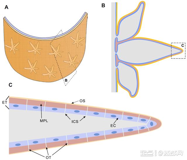 (ET=上皮组织,MPL=多边形矿化层,OS-=外部有机质层,OT=有机质框架,EC=表皮细胞)
