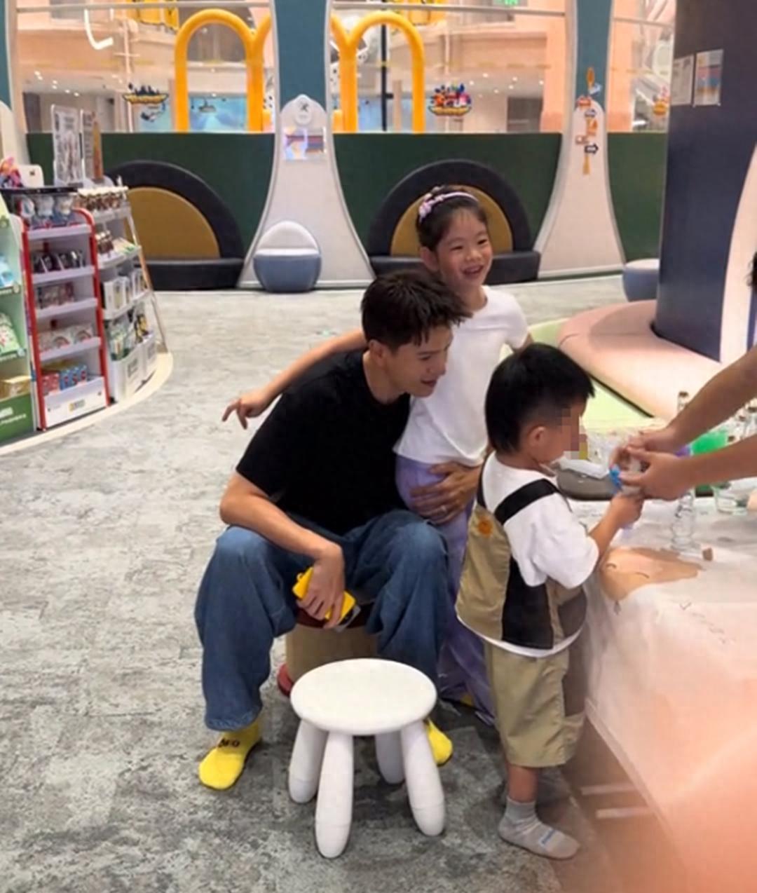 当日,经超身着黑色T恤搭配牛仔裤,简单清爽的装扮散发出满满魅力。只见经超坐在小板凳上,将女儿搂在怀中的他,父女俩一起看旁边小朋友做手工,经超脸上还洋溢着温暖的笑容,真的是好随和的一个人。