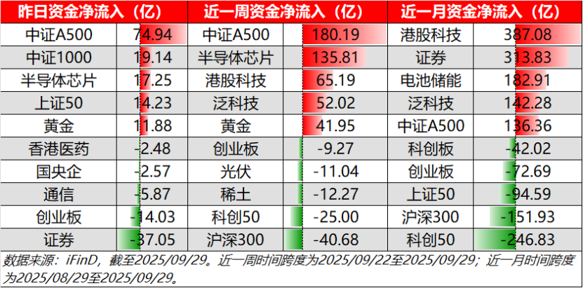 细分ETF种类上,昨日,中证A500(+74.94亿)相关ETF受到资金青睐,位居资金净流入榜首。中证1000(+19.14亿)、半导体芯片(+17.25亿)、上证50(+14.23亿)和黄金(+11.88亿)资金净流入也相对居前。证券(-37.05亿)和创业板(-14.03亿)资金净流出居前。