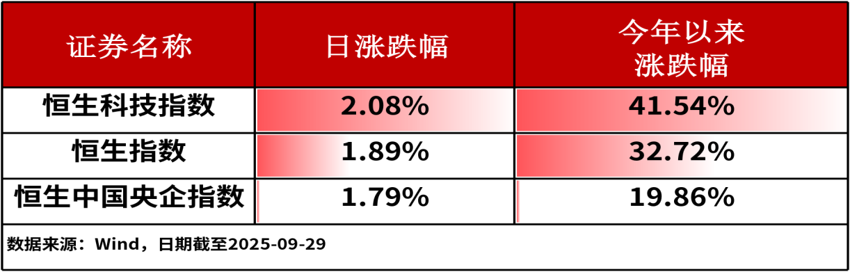 一、市场行情回顾 09月29日,A股三大股指全线收涨。其中,上证指数上涨0.90%,深证成指上涨2.05%,创业板指上涨2.74%。主流宽基指数中,创业板50上涨3.09%,涨幅相对领先。全市场共有超3,570只股票上涨。港股主流指数集