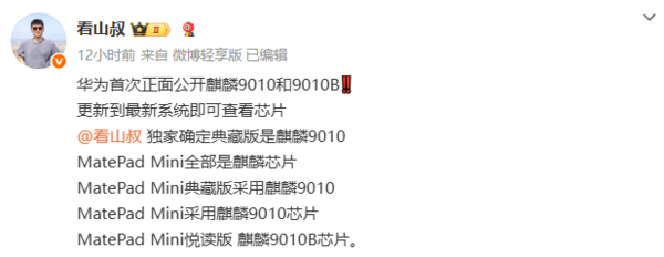 有数码博主进一步确认,华为MatePad Mini全系搭载麒麟芯片,其中典藏版和标准版为麒麟9010,悦读版则为麒麟9010B。其中,麒麟9010采用2颗2.3GHz大核+6颗2.18GHz核心+4颗1.55GHz小核的CPU核心配置,GPU为Maleoon 910,频率750MHz。而9010B在9010的基础上减少了两颗小核。
