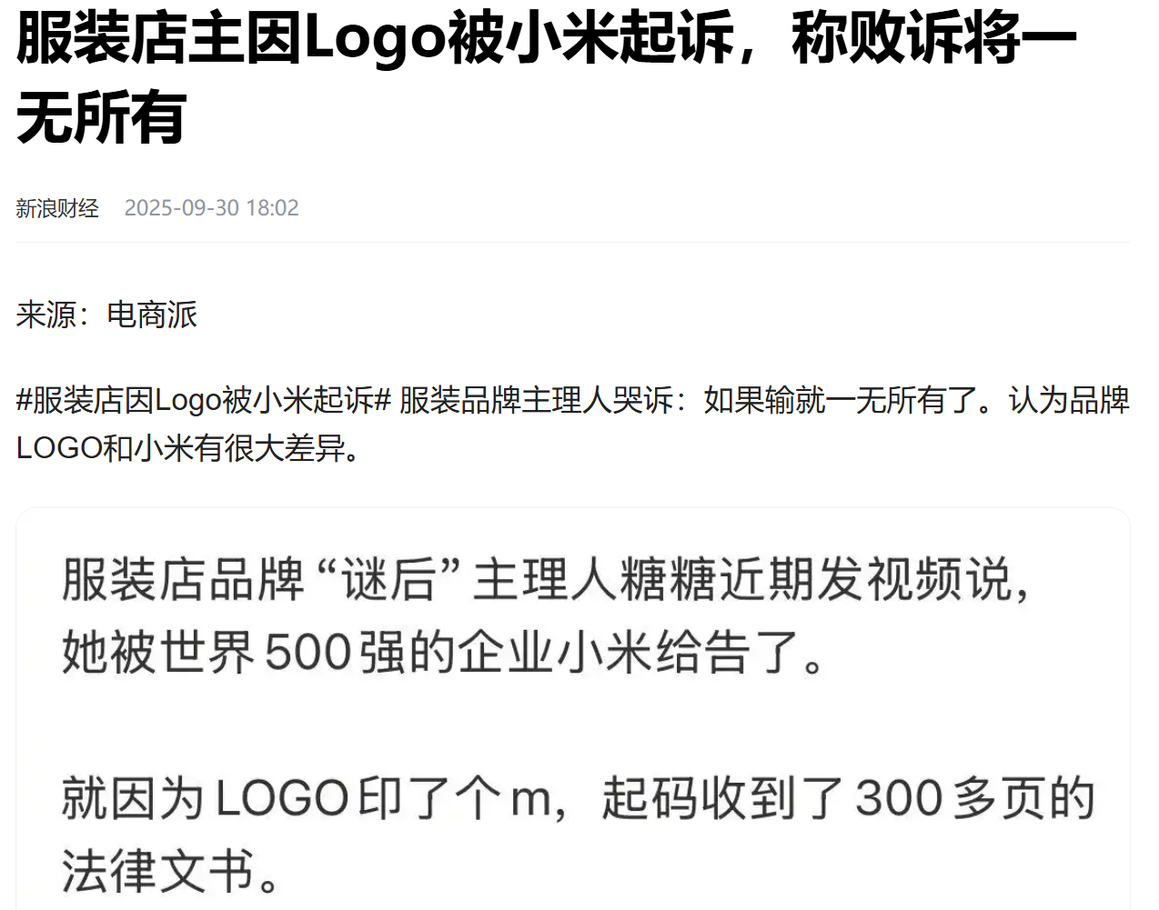 广东一服装店因LOGO被小米起诉,主理人称如果输将一无所有