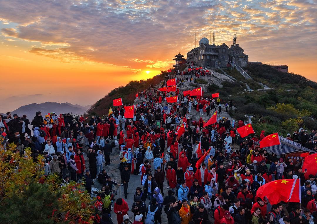 晨光破晓,一轮红日跃出天际,染红万里长空。10月1日,中华人民共和国成立76周年之际,1.3万名游客齐聚泰山之巅,以一场激情澎湃的爱国歌曲联唱,庆祝祖国华诞,让“中国红”与爱国心在山河间交相辉映。 秋日凌
