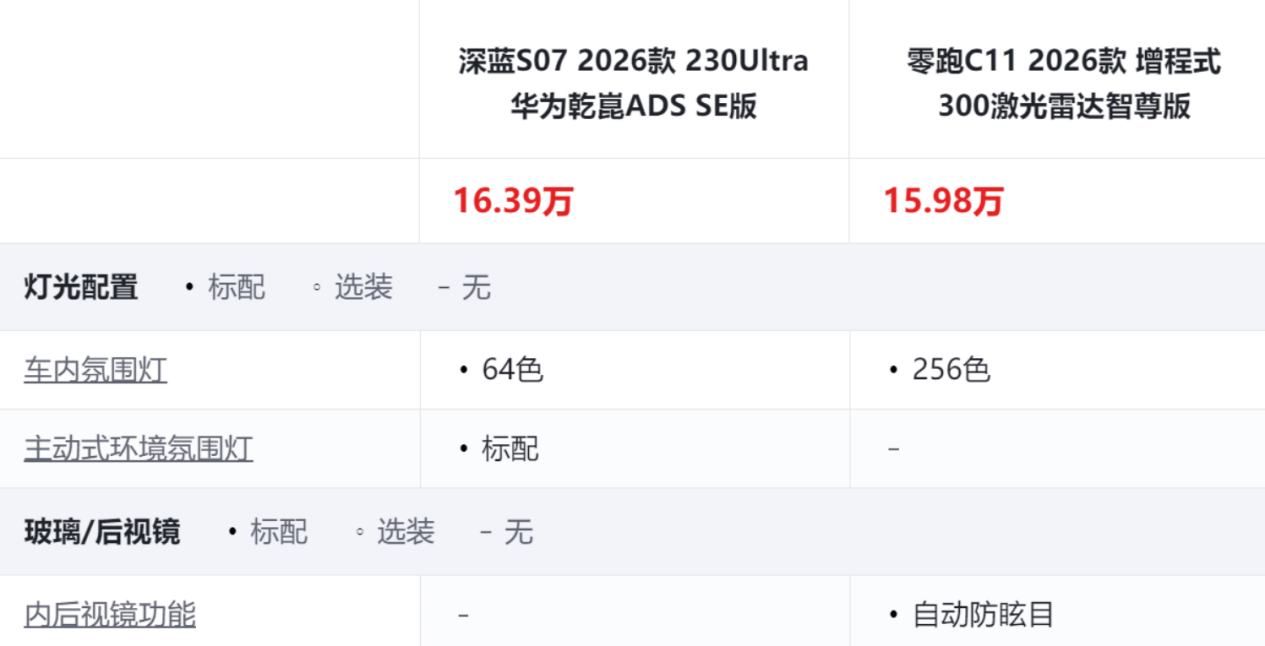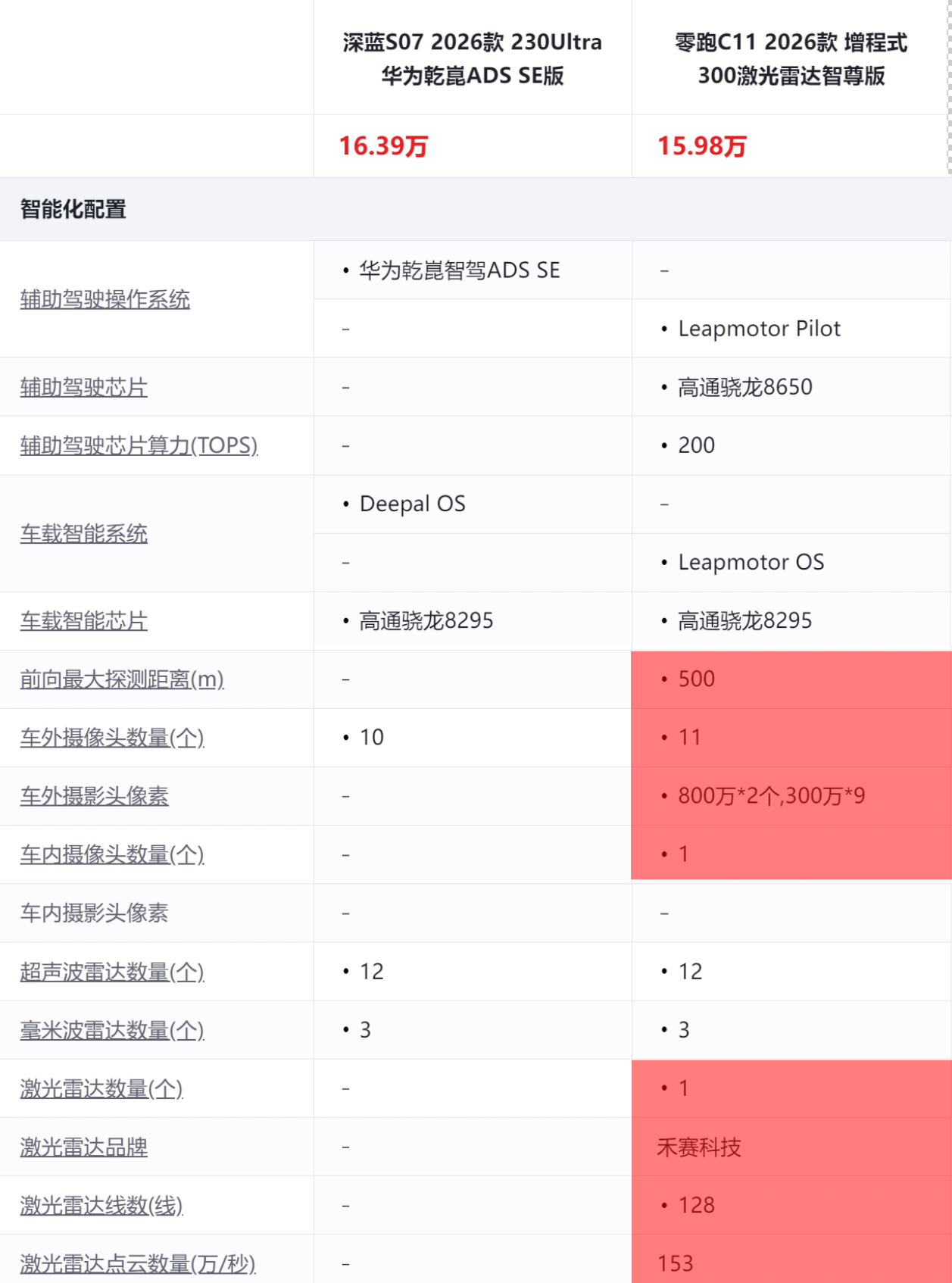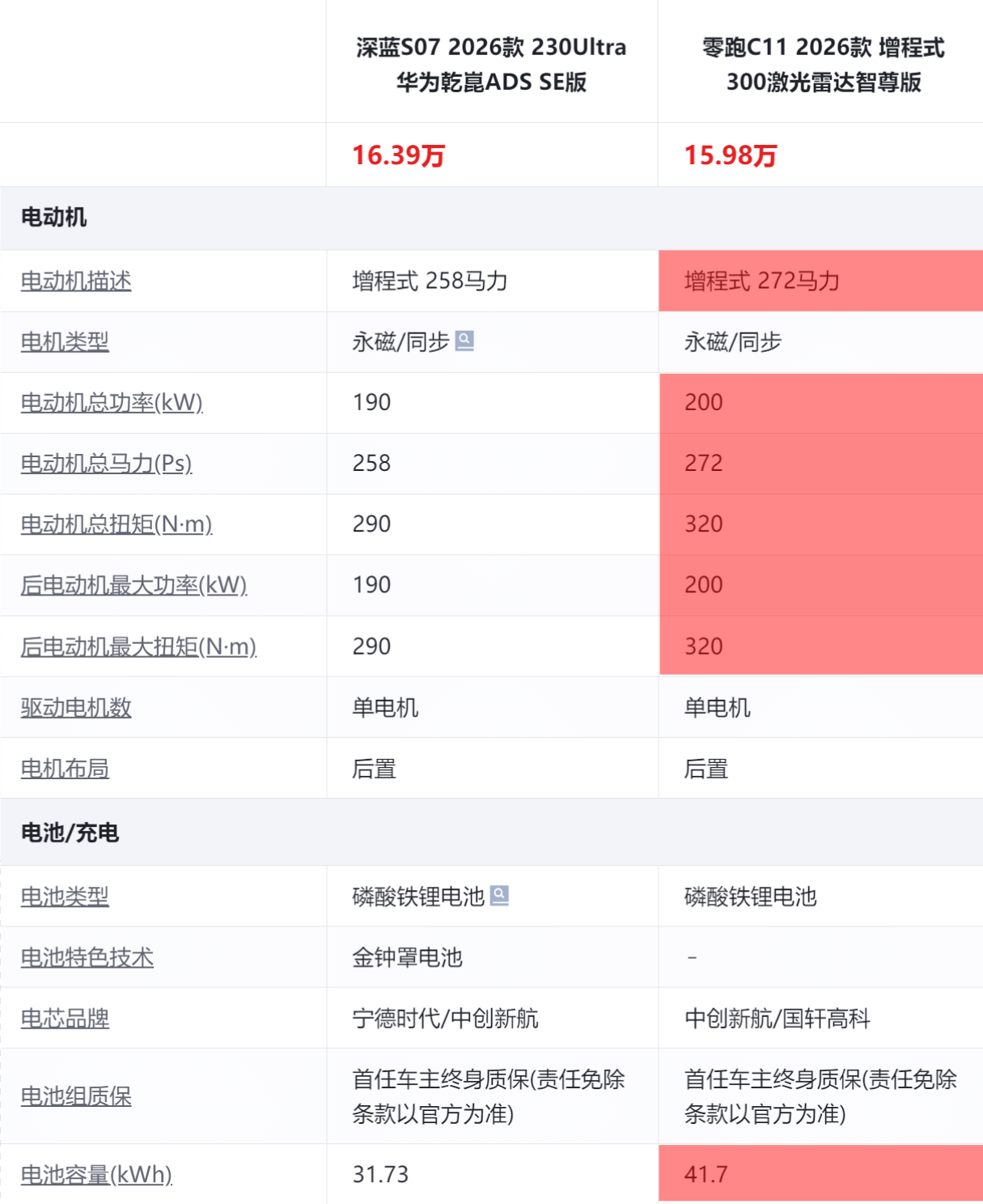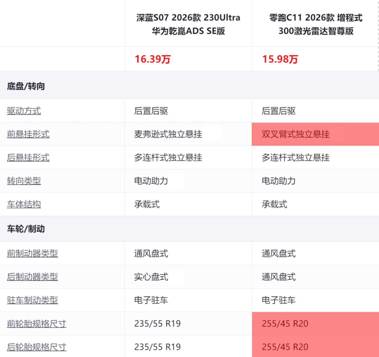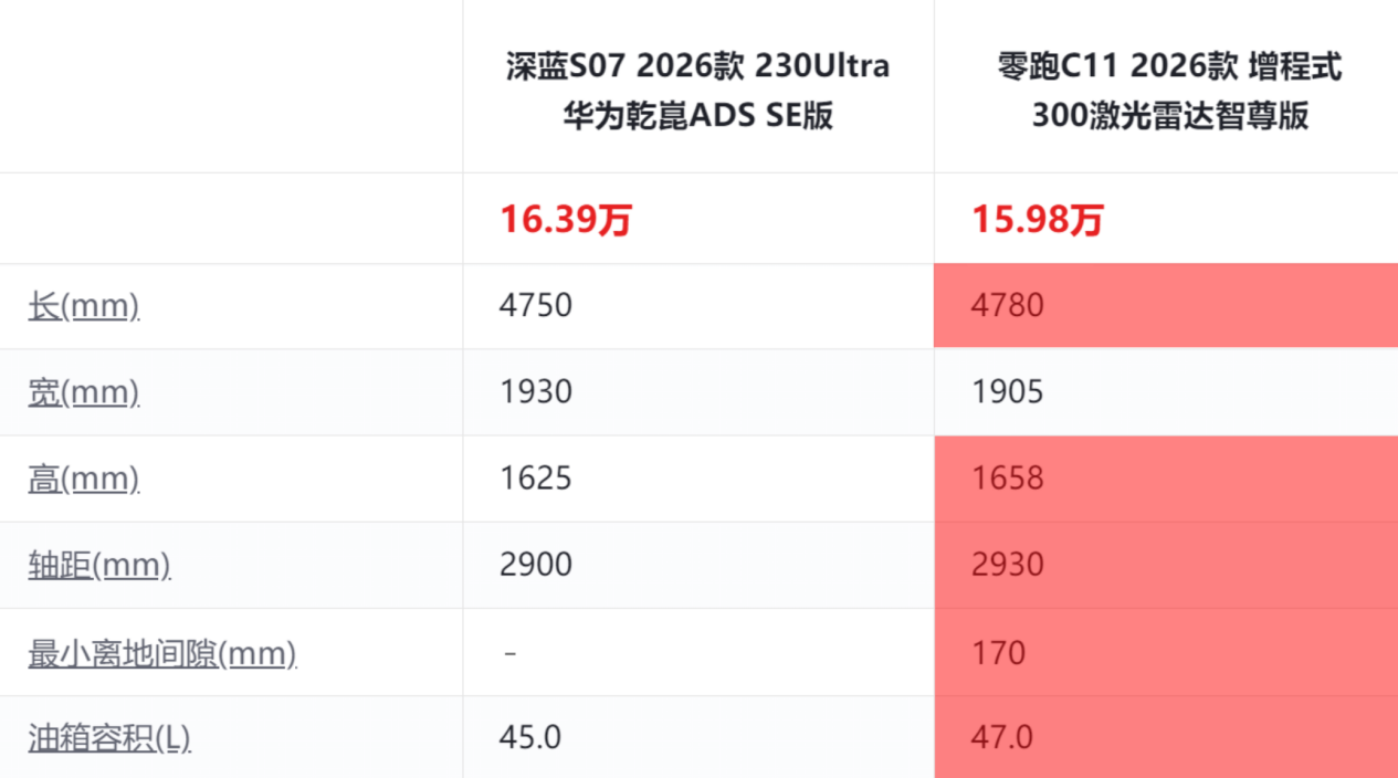 咱们选择这两款车,分别是零跑C11 2026款增程式300激光雷达智尊版,官方指导价格15.98万,深蓝S07是2026款230Ultra华为ADS SE版,官方指导价格是16.69万,但是目前有优惠,实际的经销商报价16.39万,比C11贵了大约4100块钱,能充几年的电。由于价格类似,尺寸定位也都类似,所以它们简直太适合对比了。第1个事儿咱们就是对比这个级别消费者比较看重的尺寸和空间,得有肚量。