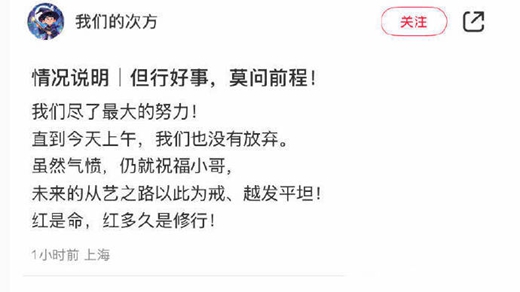 这突如其来的变故,让音乐节方措手不及。他们迅速组织了十余小时的紧张谈判,试图挽回局面。但直到10月2日凌晨1点,距离全阵容官宣不足10小时的关键时刻,音乐节方还是得到了一个令人失望的消息:由于艺人团队内部沟通管理问题,官宣无法履行。