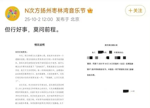 10月2日,本应是@N次方扬州枣林湾音乐节官宣全阵容、让乐迷们欢呼雀跃的日子,然而一则情况说明却如同一颗重磅炸弹,在音乐圈和乐迷群体中炸开了锅。原定参演的一位颇具人气的青年表演嘉宾,竟因经纪团队临时“